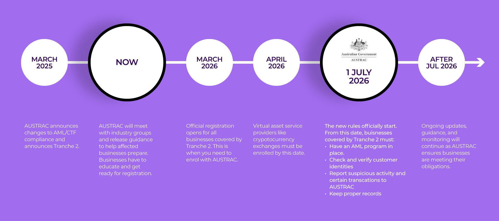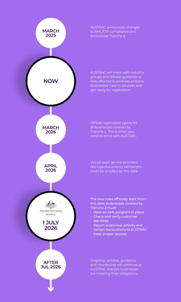- Designed for Tranche 2: Our workflows, templates and risk models are built specifically for property & real estate, legal & advisory, accounting & corp services, funds & trustees, high‑value dealers, pubs & clubs, and digital‑asset/payment firms, mapped directly to AUSTRAC’s new guidance.